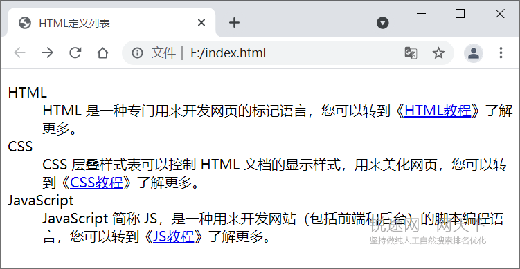 <!DOCTYPE html><html lang="en"><head><meta charset="UTF-8"><title>HTML定义列表</title></head><body><dl><dt>HTML</dt><dd>HTML 是一种专门用来开发网页的标记语言,您可以转到《<a href="http://c.biancheng.net/html/" target="_blank">HTML教程</a>》了解更多。</dd><dt>CSS</dt><dd>CSS 层叠样式表可以控制 HTML 文档的显示样式,用来美化网页,您可以转到《<a href="http://c.biancheng.net/css3/" target="_blank">CSS教程</a>》了解更多。</dd><dt>JavaScript</dt><dd>JavaScript 简称 JS,是一种用来开发网站(包括前端和后台)的脚本编程语言,您可以转到《<a href="http://c.biancheng.net/js/" target="_blank">JS教程</a>》了解更多。</dd></dl></body></html>